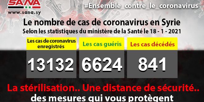 Dans un communiqué dont une copie est parvenue à SANA, le ministère a fait savoir que le bilan des cas de coronavirus enregistrés jusqu’à présent en Syrie avait atteint 13132, dont 6624 cas de guérison et 841 décès.