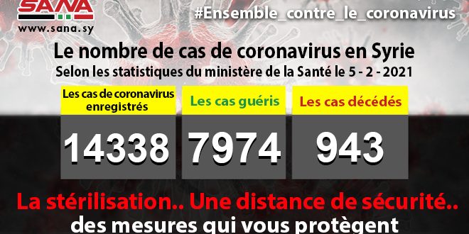 Dans un communiqué, dont une copie est parvenue à SANA, le ministère a fait savoir que le bilan des cas de coronavirus enregistrés jusqu’à présent en Syrie avait atteint 14338, dont 7974 cas de guérison et 943 décès.