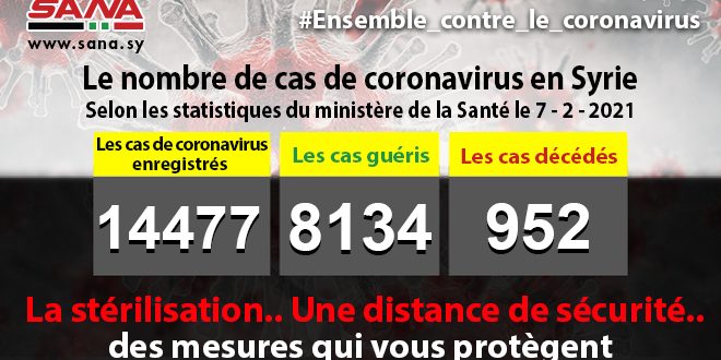 Dans un communiqué, dont une copie est parvenue à SANA, le ministère a indiqué que le bilan de cas de coronavirus enregistrés jusqu’à présent en Syrie est 14477 cas, dont 8134 cas de guérison et 952 décès.