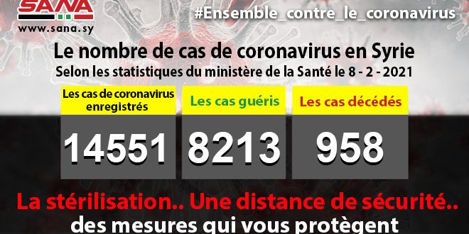 Dans un communiqué, dont une copie est parvenue à SANA, le ministère a fait savoir que le bilan des cas de coronavirus enregistrés jusqu’à présent en Syrie avait atteint 14551, dont 8213 cas de guérison et 958 décès.