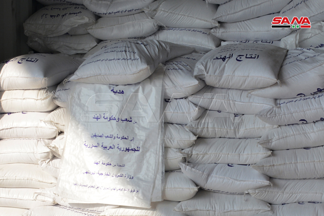 Lattaquié-SANA / La Syrie a reçu aujourd’hui la 1ère partie de la cargaison d’aide humanitaire, comprenant 2000 tonnes du riz indien, offertes par le gouvernement et le peuple en Inde.