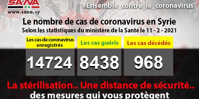 Dans un communiqué, dont une copie est parvenue à SANA, le ministère a fait savoir que le bilan des cas de coronavirus enregistrés jusqu’à présent en Syrie avait atteint 14724, dont 8438 cas de guérison et 968 décès.