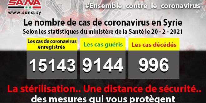 Dans un communiqué, dont une copie est parvenue à SANA, le ministère a souligné que le nombre des cas de coronavirus enregistrés jusqu’à présent en Syrie avait atteint 15143 cas, dont 9144 cas de guérison et 996 décès.
