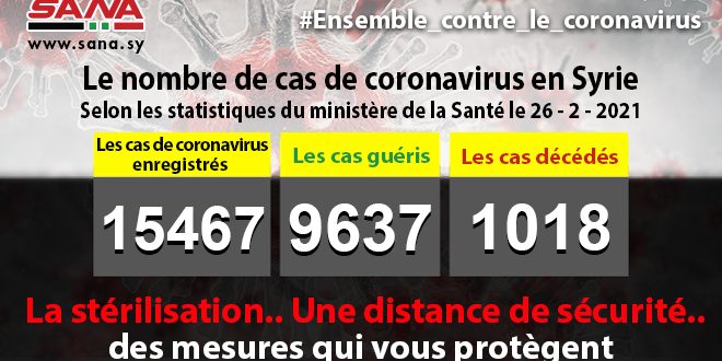 Dans un communiqué, dont une copie est parvenue à SANA, le ministère a indiqué que le nombre de cas de coronavirus enregistrés jusqu’à présent en Syrie avait atteint 15467 cas, dont 9637 cas de guérison et 1018 décès.
