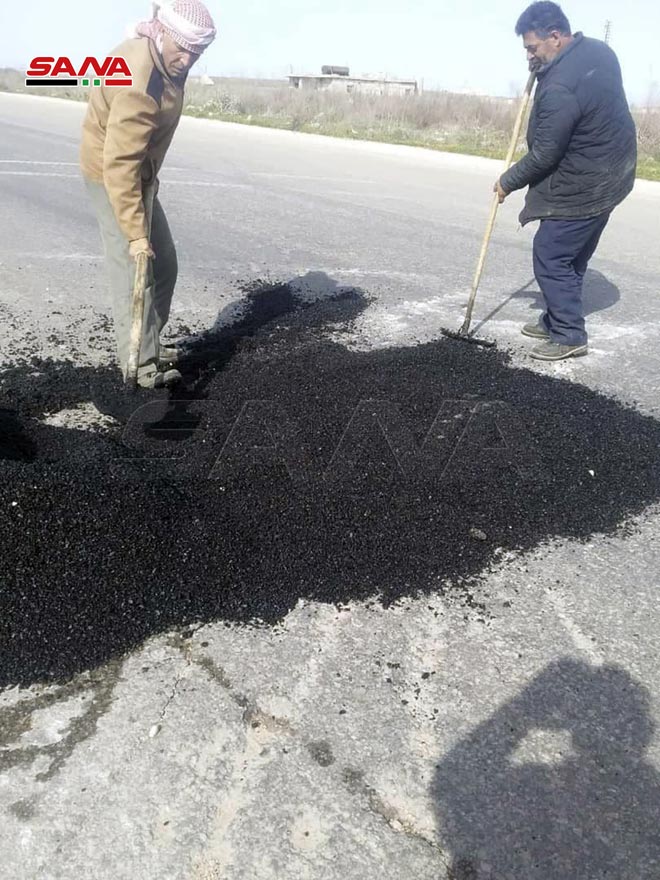 Hama – SANA/ La branche de l’Etablissement générale des transports routiers à Hama a effectué les travaux de maintenance urgent sur l’autoroute internationale /Hama – Alep/ dans les limites administratives de la banlieue du gouvernorat d’Idleb libérée du terrorisme, pour assurer la sécurité routière de ses utilisateurs entre les deux zones de Khan Cheikhone et de Ma’aret Numan.