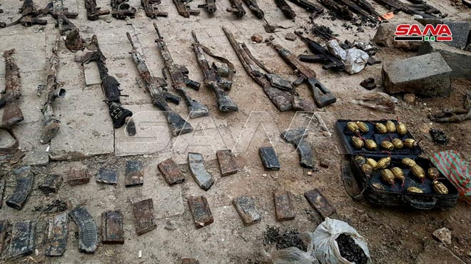 Homs-SANA / Les services compétents ont découvert de grandes quantités d’armes et de munitions cachées dans une maison arabe dans le quartier de Hamidiyah, que les groupes terroristes utilisaient comme un QG avant leur expulsion.