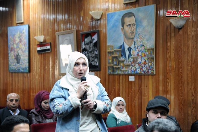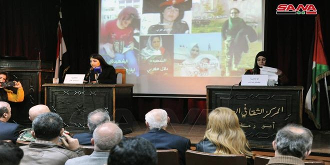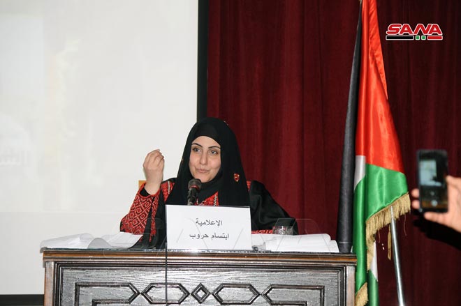 Lors de la conférence organisée par l’Institution internationale d’al-Qods/Syrie/, en coopération avec le comité populaire arabe syrien pour le soutien du peuple palestinien, de la résistance au complot sioniste et de l’Alliance des forces palestiniennes, la journaliste Haroub a mis en exergue les guerres et les étapes historiques de la lutte de la femme palestinienne qui s’attache et poursuit son rôle résistant pour mettre en échec tous les compotes visant la cause palestinienne jusqu’à la libération du territoire.
