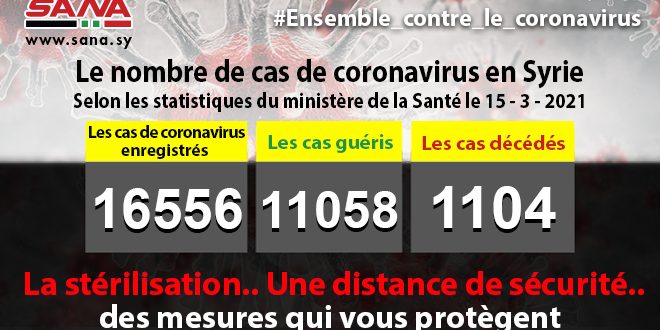 Dans un communiqué, dont une copie est parvenue à SANA, le ministère a fait savoir que le nombre des cas de coronavirus enregistrés jusqu’à présent en Syrie avait atteint 16556 cas, dont 11058 cas de guérison et 1104 décès