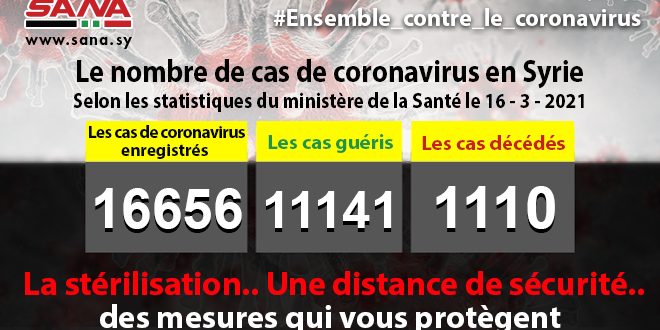 Dans un communiqué, dont une copie est parvenue à SANA, le ministère a fait savoir que le nombre des cas de coronavirus enregistrés jusqu’à présent en Syrie avait atteint 16656 cas, dont 11141 cas de guérison et 1110 décès.