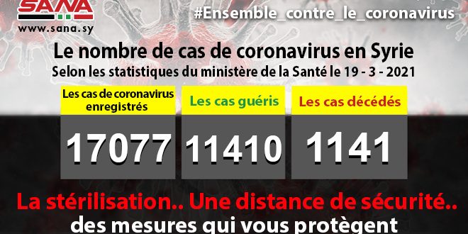 Dans un communiqué, dont une copie est parvenue à SANA, le ministère a fait savoir que le nombre des cas de coronavirus enregistrés jusqu’à présent en Syrie avait atteint 17077 cas, dont 11410 cas de guérison et 1141 décès.