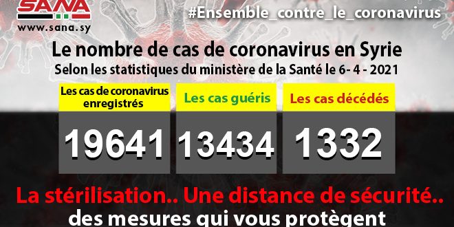 Dans un communiqué, dont une copie est parvenue à SANA, le ministère a fait noter que le nombre des cas de coronavirus enregistrés jusqu’à présent en Syrie avait atteint 19641, dont 13434 cas de guérison et 1332 décès.
