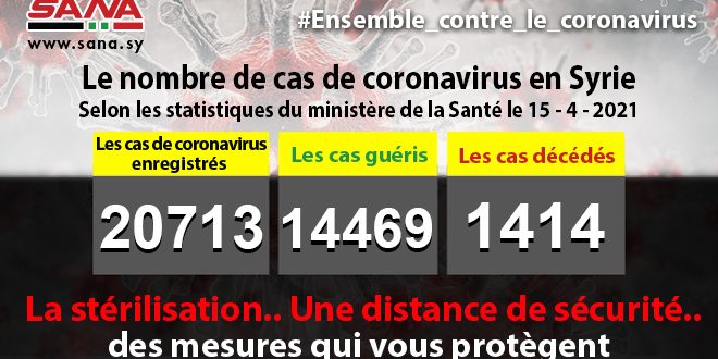 Dans un communiqué, dont une copie est parvenue à SANA, le ministère a fait savoir que le nombre des cas de coronavirus enregistrés jusqu’à présent en Syrie avait atteint 20713, dont 14469 cas de guérison et 1414 décès.