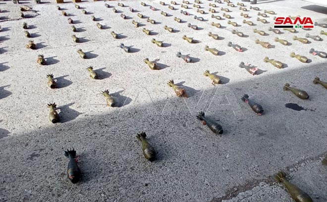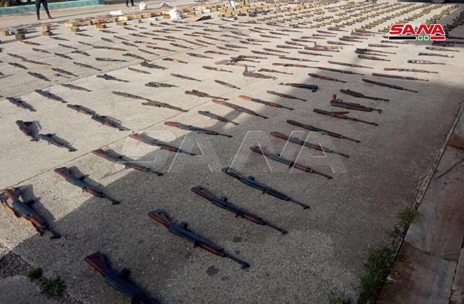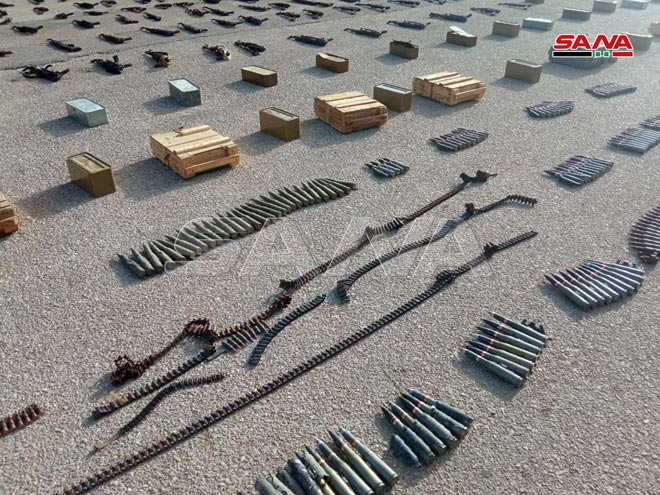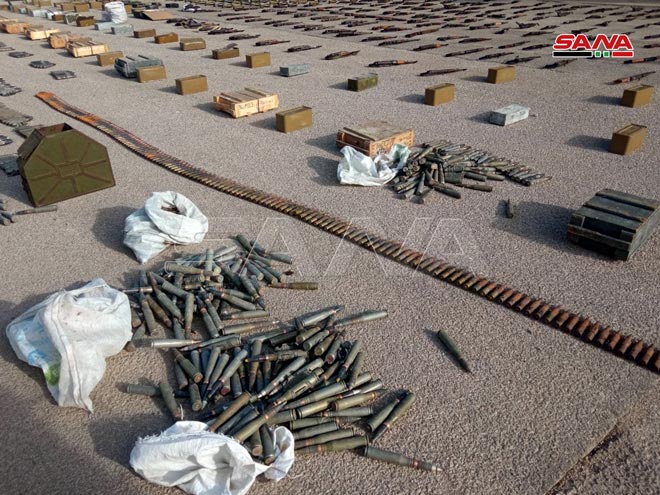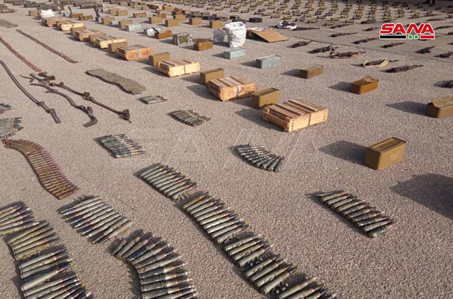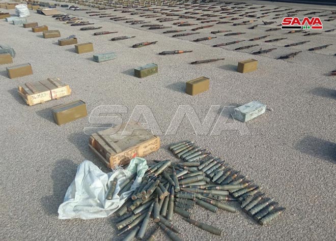 Le correspondant de SANA à Homs a indiqué que les services compétents avaient découvert, alors qu’ils poursuivent les opérations du ratissage dans la banlieue est, de grandes quantités d’armes et de munitions, dont 221 obus de mortier, 264 fusils, 3 mortiers,110 caises de munitions et 115 grenades avec des détonateurs.