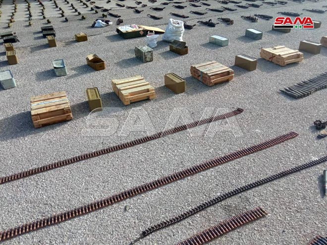 Homs -SANA/Les services compétents à Homs ont découvert de grandes quantités d’armes et de munitions abandonnées par les terroristes dans la banlieue est.