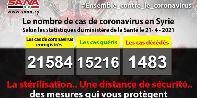 Dans un communiqué, dont une copie est parvenue à SANA, le ministère a fait savoir que le nombre des cas de coronavirus enregistrés jusqu’à présent en Syrie avait atteint 21584, dont 15216 cas de guérison et 1483 décès.