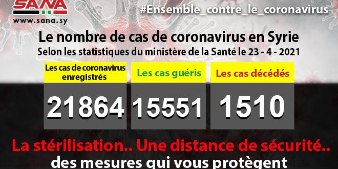 Dans un communiqué, dont une copie est parvenue à SANA, le ministère a fait savoir que le nombre des cas de coronavirus enregistrés jusqu’à présent en Syrie avait atteint 21864, dont 15551 cas de guérison et 1510 décès.