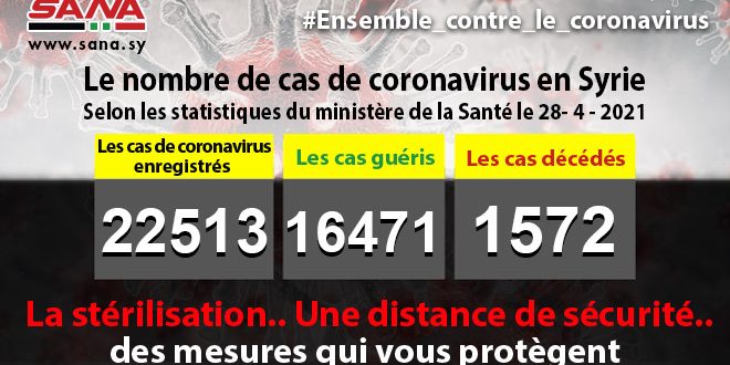 Dans un communiqué, dont une copie est parvenue à SANA, le ministère a fait savoir que le nombre des cas de coronavirus enregistrés jusqu’à présent en Syrie avait atteint 22513, dont 16471 cas de guérison et 1572 décès.