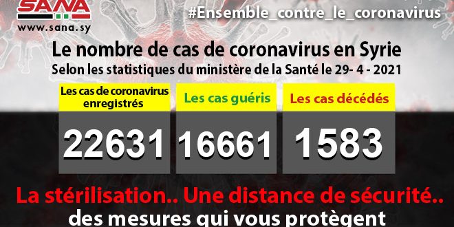 Dans un communiqué, dont une copie est parvenue à SANA, le ministère a fait savoir que le nombre des cas de coronavirus enregistrés jusqu’à présent en Syrie avait atteint 22631, dont 16661 cas de guérison et 1583 décès.