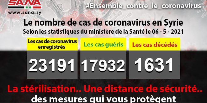Dans un communiqué dont une copie est parvenue à SANA, le ministère a fait savoir que le bilan des cas de coronavirus enregistrés jusqu’à présent en Syrie avait atteint 23191, dont 17932 cas de guérison et 1631 décès.