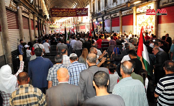 Damas – SANA/Sous le titre d’ “al-Qods est plus proche”, une marche pour commémorer la Journée mondiale d’al-Qods est lancée aujourd’hui à Damas, de l’entrée du marché d’al-Hamidiyah vers la mosquée des Omeyyades, avec une large participation populaire.