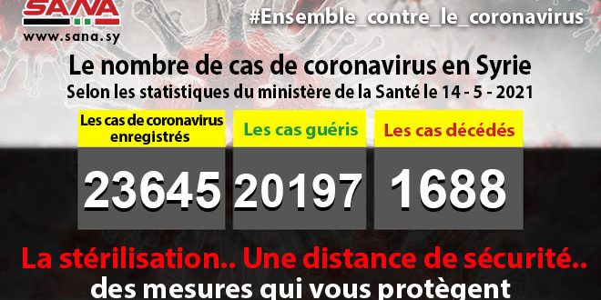 Dans un communiqué dont une copie est parvenue à SANA, le ministère a fait savoir que le bilan des cas de coronavirus enregistrés jusqu’à présent en Syrie avait atteint 23645, dont 20197 cas de guérison et 1688 décès.