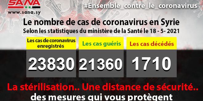Dans un communiqué dont une copie est parvenue à SANA, le ministère a fait savoir que le bilan des cas de coronavirus enregistrés jusqu’à présent en Syrie avait atteint 23830, dont 21360 cas de guérison et 1710 décès.