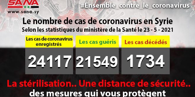Dans un communiqué dont une copie est parvenue à SANA, le ministère a fait savoir que le bilan des cas de coronavirus enregistrés jusqu’à présent en Syrie avait atteint 24117, dont 21549 cas de guérison et 1734 décès.