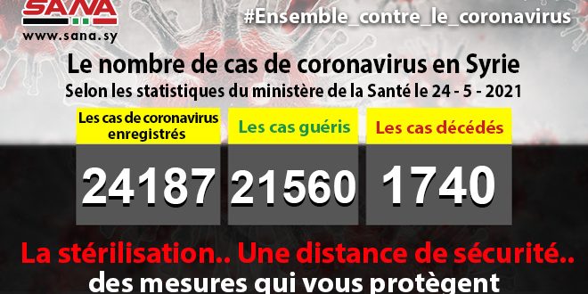 Dans un communiqué dont une copie est parvenue à SANA, le ministère a fait savoir que le bilan des cas de coronavirus enregistrés jusqu’à présent en Syrie avait atteint 24187, dont 21560 cas de guérison et 1740 décès.