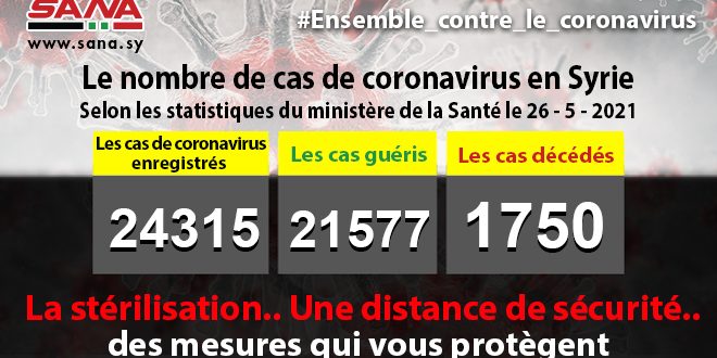 Dans un communiqué dont une copie est parvenue à SANA, le Ministère a fait savoir que le bilan des cas de coronavirus enregistrés jusqu’à présent en Syrie avait atteint 24315, dont 21577 cas de guérison et 1750 décès.