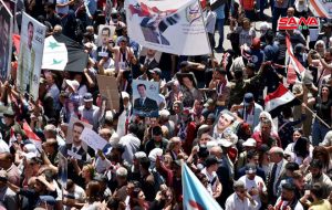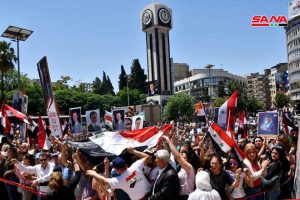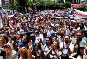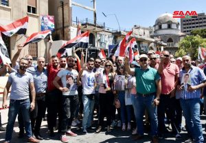 Les participants au rassemblement ont porté le drapeau national et des photos de Dr al-Assad et scandé avec joie pour la victoire de Dr Bachar al-Assad au poste du président de la République, soulignant qu’ils ont choisi le candidat le plus capable de diriger la Syrie.