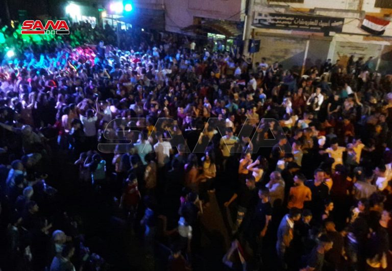 Homs- SANA/Célébrant la victoire du Dr Bachar al-Assad au poste de Président de la République arabe syrienne, les habitants d’Al-Moukhram à Homs ont organisé un grand rassemblement public et civil sur la place de la localité d’al-Moukhram.
