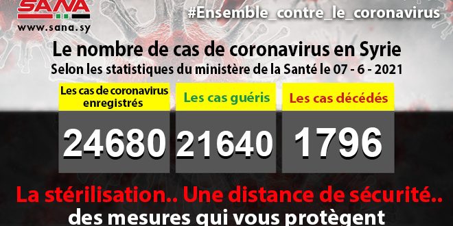 Dans un communiqué dont une copie est parvenue à SANA, le ministère a fait savoir que le bilan des cas de coronavirus enregistrés jusqu’à présent en Syrie avait atteint 24680, dont 21640 cas de guérison et 1796 décès.