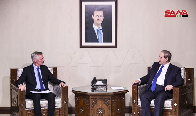 Damas-SANA/Le ministre des Affaires étrangères et des Expatriés, Fayçal al-Miqdad, a reçu aujourd’hui les lettres de créance de Christoph Martin, nouveau président de la mission du Comité international de la Croix-Rouge en Syrie.