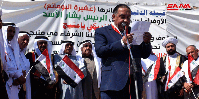Alep-SANA/ Les habitants et les tribus des localités de Wadha et Ha’et dans la banlieue de Maskana à Alep ont organisé un sit-in de solidarité pour soutenir la fermeté des habitants de Manbej face aux pratiques criminelles de la milice des « FDS » et les deux occupations américaine et turque.