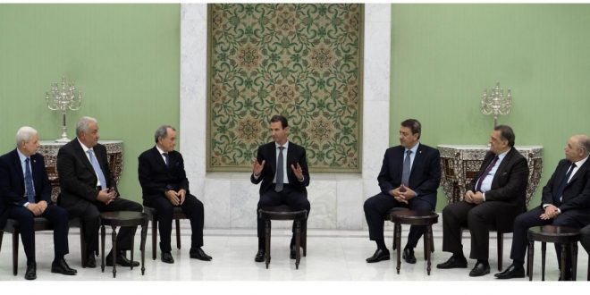 Damas-SANA / Le président Bachar al-Assad a reçu aujourd’hui une délégation regroupant les participants à la réunion, tenue à Damas, du bureau permanent de l’Union des avocats arabes.
