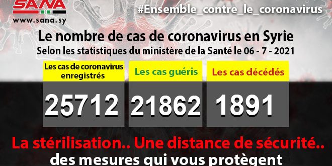 Dans un communiqué, dont une copie est parvenue à SANA, le ministère a fait savoir que le bilan des cas de coronavirus enregistrés jusqu’à présent en Syrie avait atteint 25712, dont 21862 cas de guérison et 1891 décès.