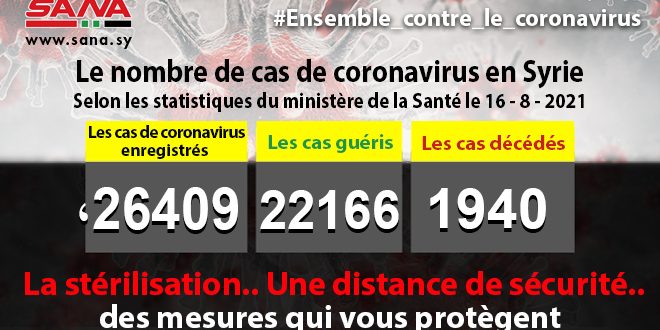 Dans un communiqué, dont une copie est parvenue à SANA, le ministère a fait noter que le bilan des cas de coronavirus enregistrés jusqu’à présent en Syrie avait atteint 26409, dont 22166 cas de guérison et 1940 décès.