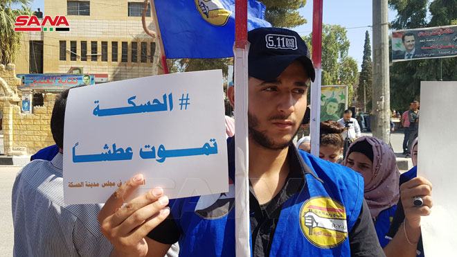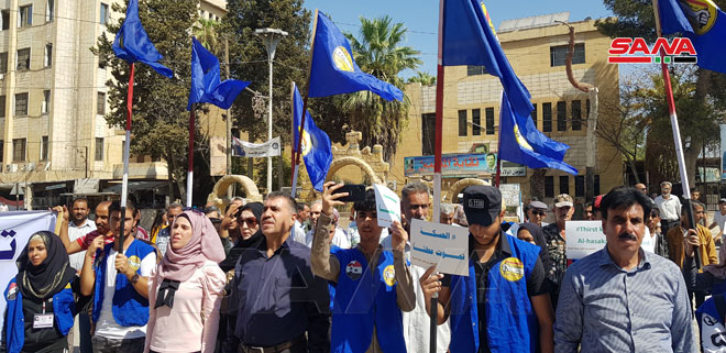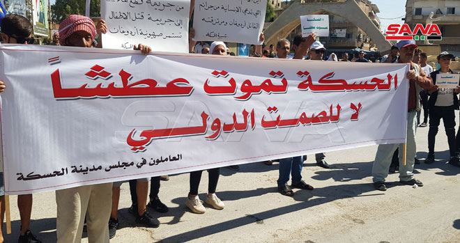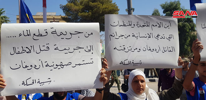 Hassaké –SANA/Les habitants du gouvernorat de Hassaké ont observé aujourd’hui un sit-in de protestation pour rejeter les crimes de l’occupant turc qui prive plus d’un million de citoyens de l’eau potable en interdisant le pompage de l’eau potable depuis la station d’Allouk.