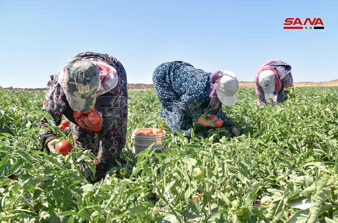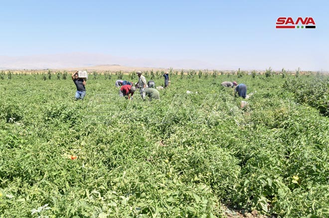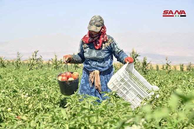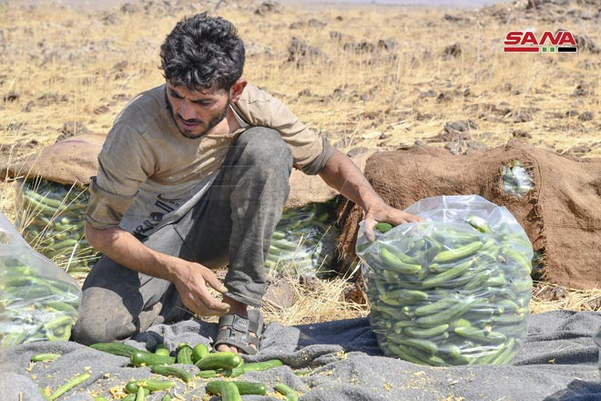Les agriculteurs de la localité de Deir Maker dans la banlieue de Damas récoltent leurs produits estivaux