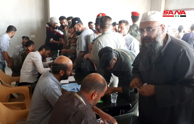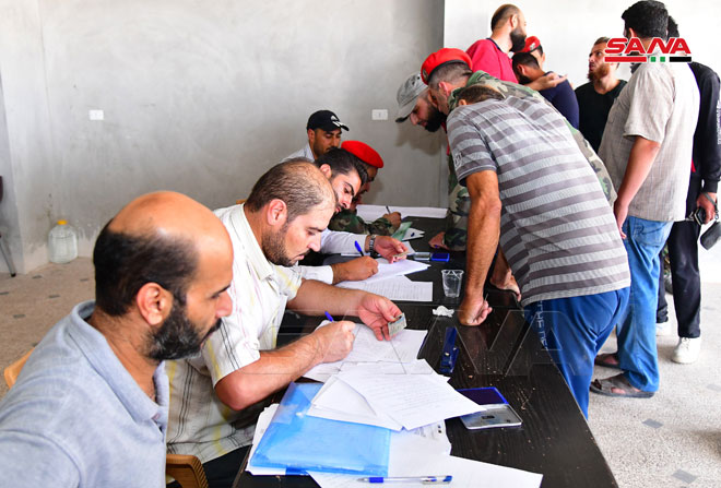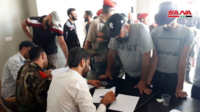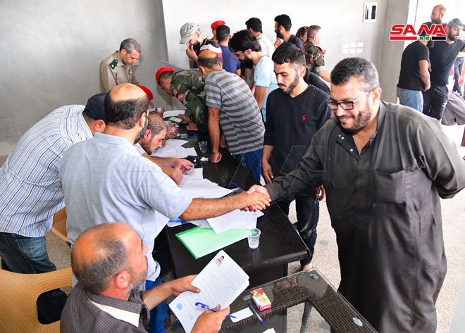 Daraa-SANA / En application de l’accord sur la régularisation proposé par l’Etat syrien, la situation de dizaines de personnes à Daraa al-Balad, qui ont déposé leurs armes, avait été régularisée au centre de régularisation dans le quartier d’al-Arbaïne.