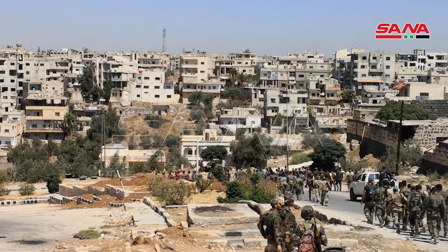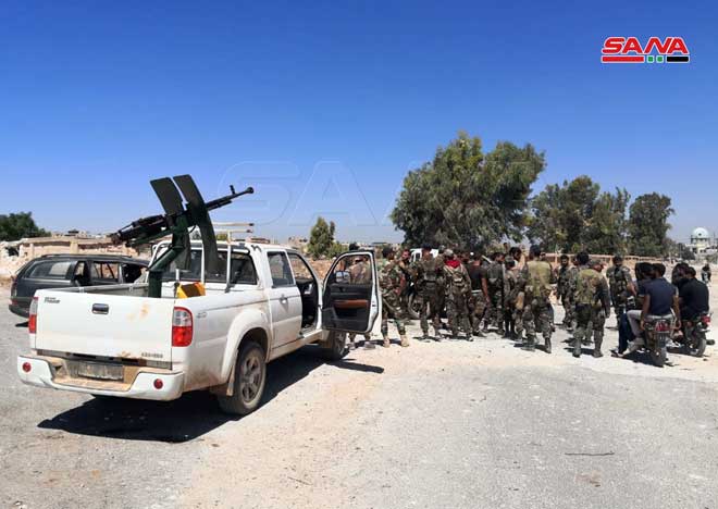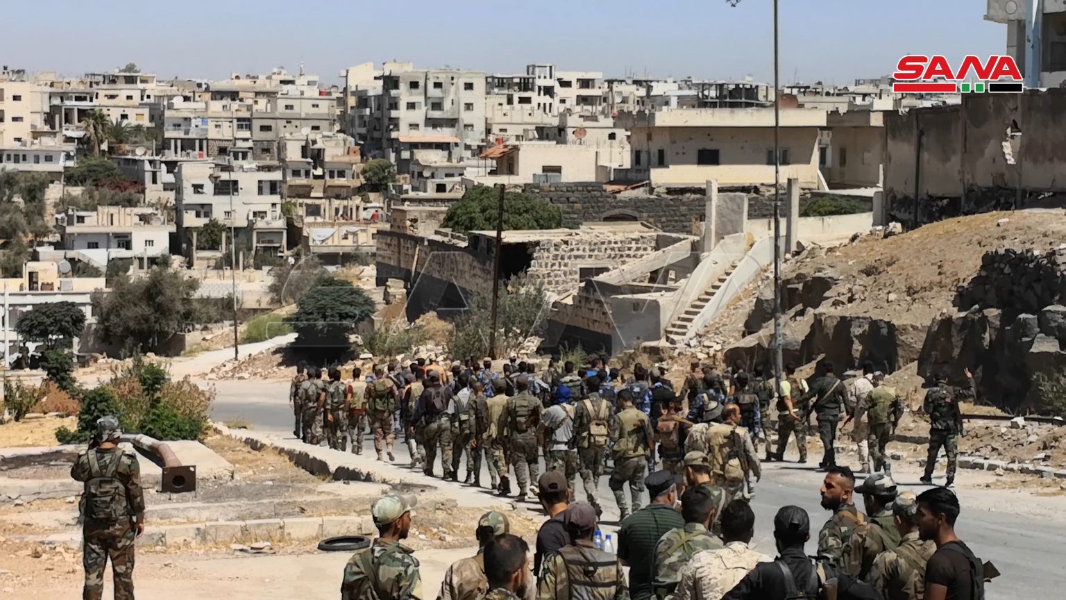 Daraa-SANA/ Des unités de l’armée arabe syrienne sont entrées ce matin dans la zone de Daraa al-Balad, et elles ont hissé le drapeau national au-dessus du centre de règlement dans le quartier d’al-Arbaïne, et ce, dans le cadre de l’accord de règlement proposé par l’Etat, portant régularisation de la situation des hommes armés, remise des armes à l’armée et sortie des terroristes.