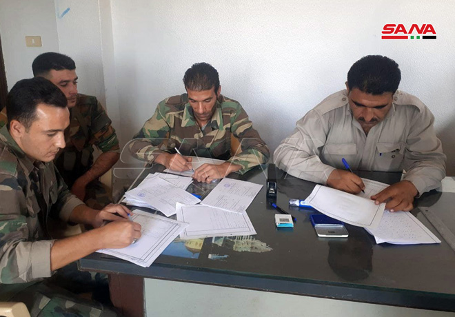 Le correspondant de SANA a fait savoir que pour le 2e jour consécutive, le processus de la régularisation de la situation des hommes armés, des personnes recherchées et des déserteurs et de la livraison des armes à l’armée arabe syrienne se poursuit dans le bâtiment de la municipalité de la localité de Mezeirib dans la banlieue ouest de Daraa,
