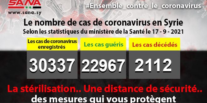 Dans un communiqué, dont une copie est parvenue à SANA, le ministère a fait noter que le bilan des cas de coronavirus enregistrés jusqu’à présent en Syrie avait atteint 30337, dont 22967 cas de guérison et 2112 décès.