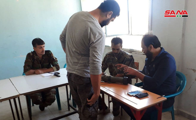Daraa -SANA/Dans le cadre de l’accord de règlement proposé par l’État, la situation de dizaines d’hommes armés, de personnes recherchées et échappées au service militaire de plusieurs villages et localités de la zone de Bassin de Yarmouk a été régularisée dans un centre de règlement ouvert dans le village de Sahem al-Golan dans la banlieue ouest de Daraa.