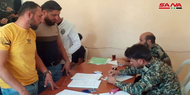 Daraa -SANA/Les zones incluses dans l’accord de règlement avancé en août dernier par l’État, se sont étendue pour comprendre la banlieue est et sud-est du gouvernorat de Daraa, où le processus de régularisation de la situation d’un certain nombre d’hommes armés et recherchés et de déserteurs du service militaire et la remise d’armes à l’armée arabe syrienne a commencé aujourd’hui dans le village de Nassib à proximité de la frontière jordanienne.