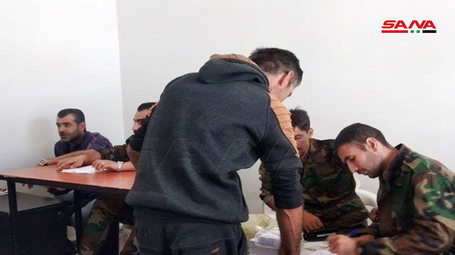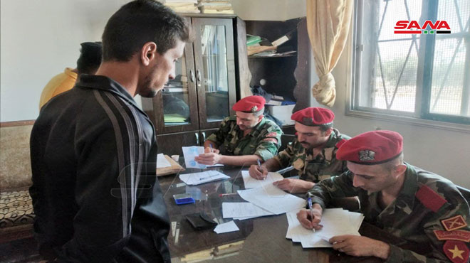 La correspondante de SANA à Daraa a fait savoir que les services compétents avaient commencé le processus de la régularisation de la situation d’un certain nombre d’hommes armés et recherchés et de personnes qui ont échappé au service militaire de la localité de Saida, Kehil et Na’imeh, en présence d’un certain nombre de dignitaires, et ce, dans le but de compléter les processus de règlement qui étaient achevés dans plusieurs localités, villes et villages dans le gouvernorat, conformément à l’accord du règlement avancé par l’Etat pour établir la sécurité et la stabilité.