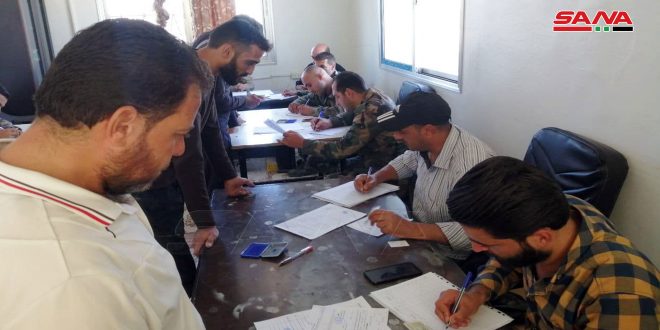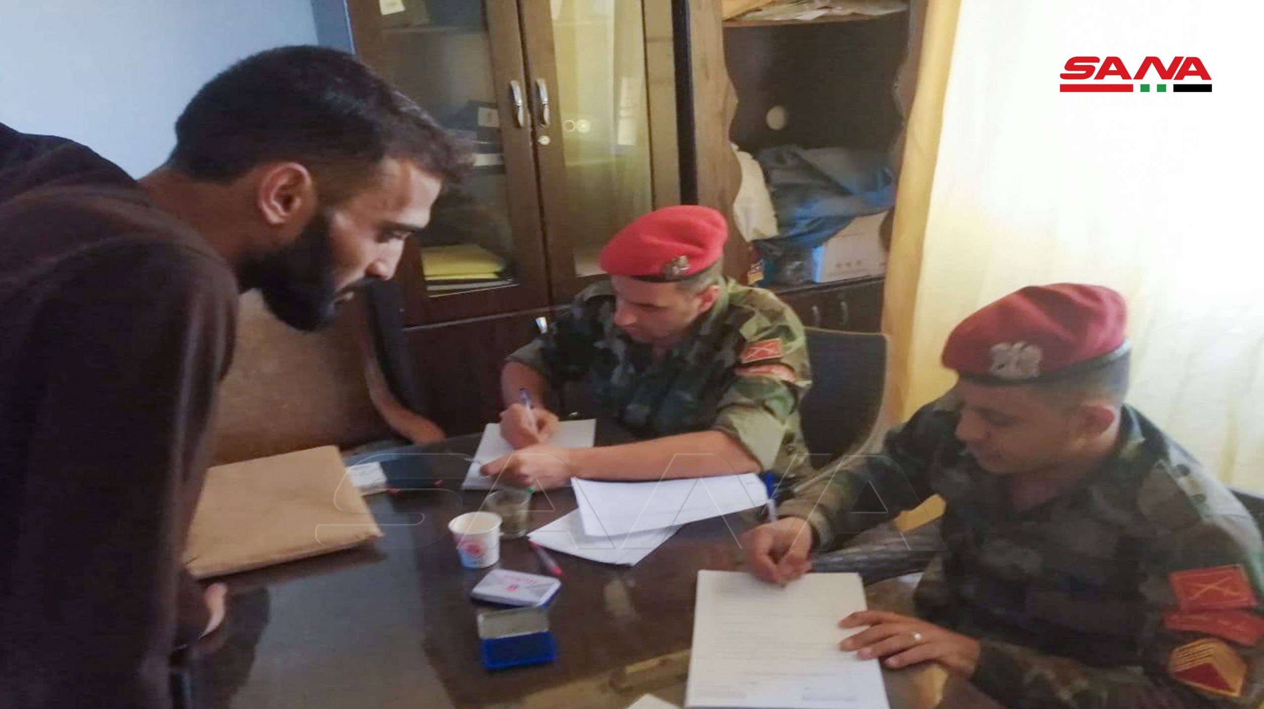 Daraa-SANA/Le processus de la régularisation de la situation d’un certain nombre d’hommes armés et recherchés et de déserteurs du service militaire, et de la remise des armes à l’armée arabe syrienne se poursuit dans la localité de Saida et à son alentour à l’est de la ville de Daraa, conformément à l’accord avancé par l’Etat.