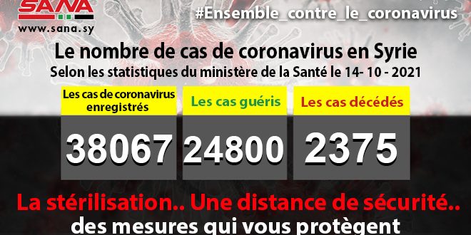 Dans un communiqué, dont une copie est parvenue à SANA, le ministère a fait savoir que le bilan des cas de coronavirus enregistrés jusqu’à présent en Syrie avait atteint 38067, dont 24800 cas de guérison et 2375 décès.