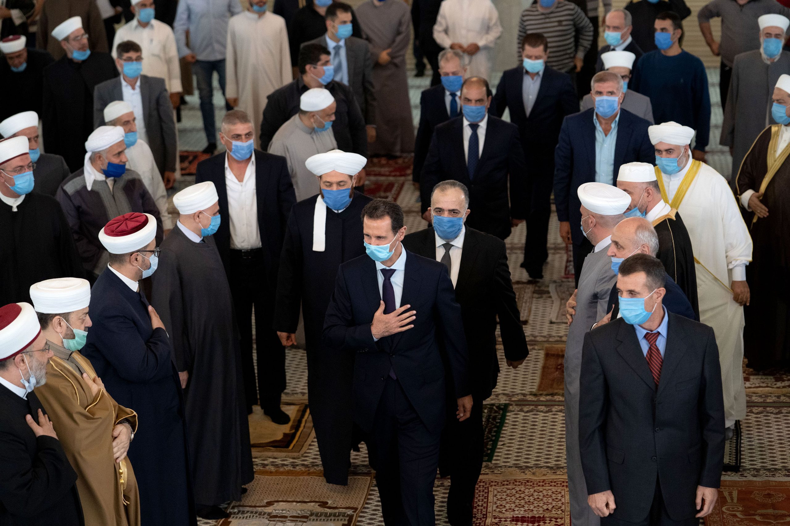 Damas-SANA / Le président Bachar al-Assad a pris part à une cérémonie religieuse, organisée aujourd’hui par le Ministère des Waqfs, à l’occasion du Mouloud (fête de naissance du prophète Mohammad) dans la mosquée de l’Imam Chaf’i à Mazzeh où il a effectué Salat Maghrib.