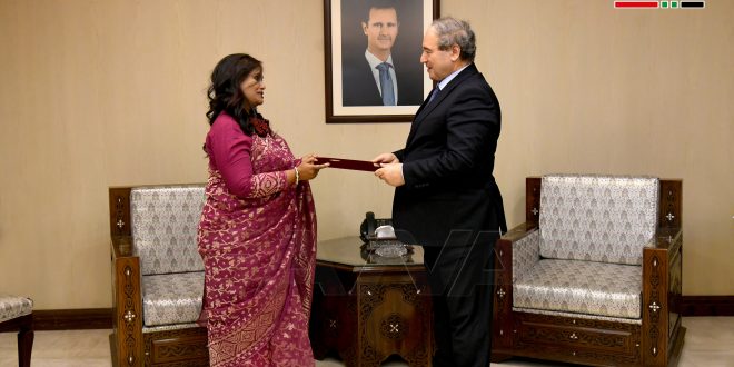 Damas-SANA /Le ministre des Affaires Etrangères et des Expatriés, Fayçal Miqdad a reçu aujourd’hui les lettres de créance de l’ambassadrice Nahed Soubhani, en tant qu’ambassadeur non résident de la République populaire du Bangladesh en République arabe Syrienne.